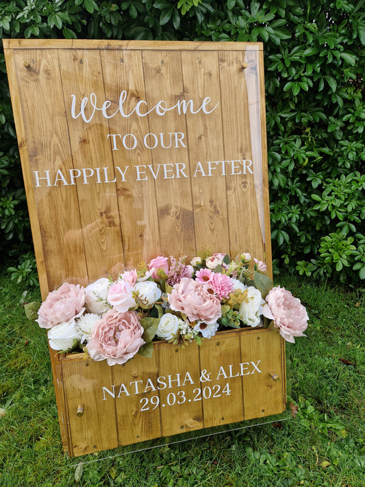 Welcome Natural Wood Flower Box Freestanding Easel Sign