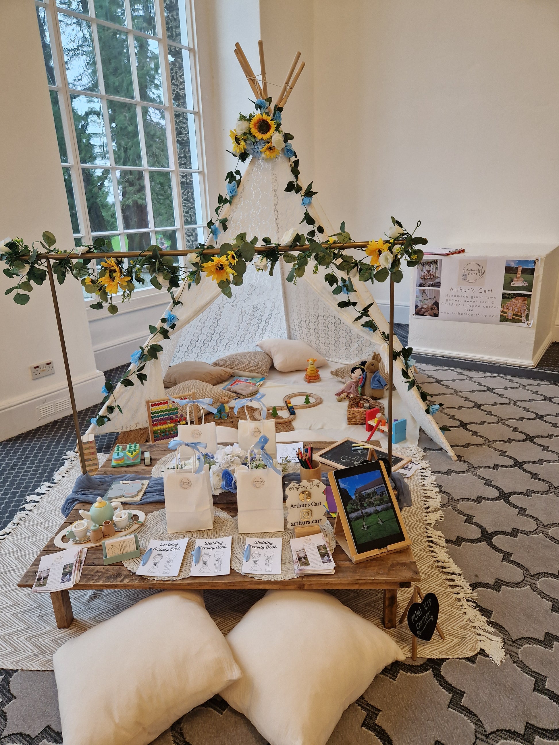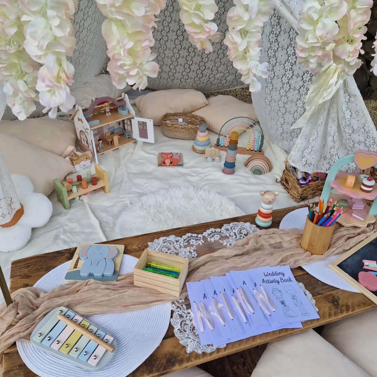 🌸 VIP Teepee corner package 🌸 - ♡ lace teepee tent- decorated to match your theme ♡ sensory lights ♡ cushions and throws to make it extra comfy! ♡ traditional wooden toys ♡ perosnalised activity books and crafts ♡ book corner ♡ mini sweet cart ♡ mini selfie corner with props and selfie stand ♡ glowsticks and flower crowns ♡low table decorated with flowers, gold arch and placemats and favours bags