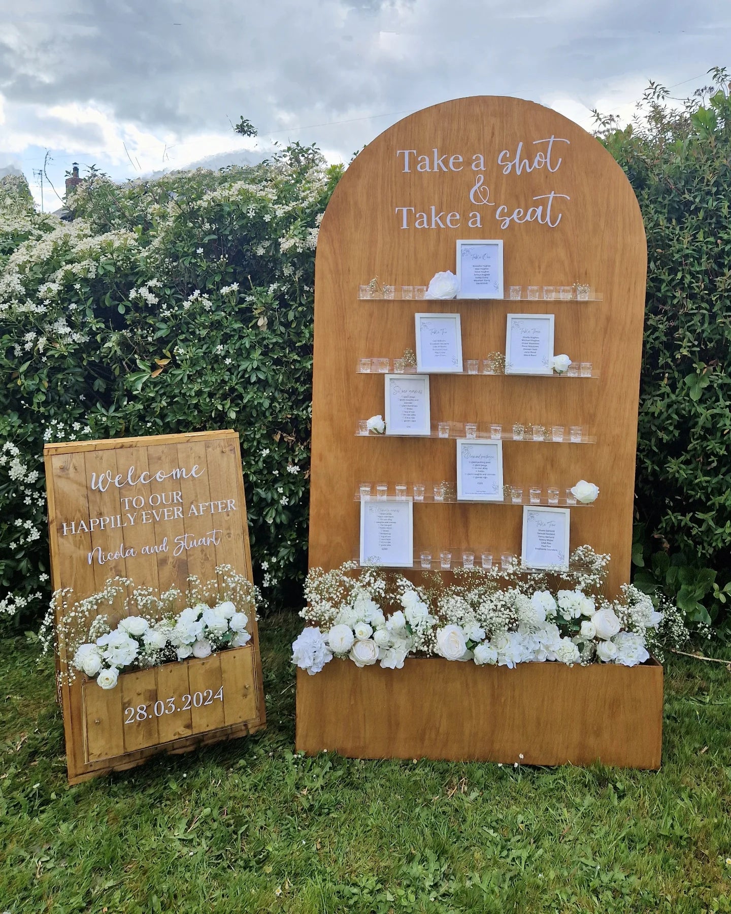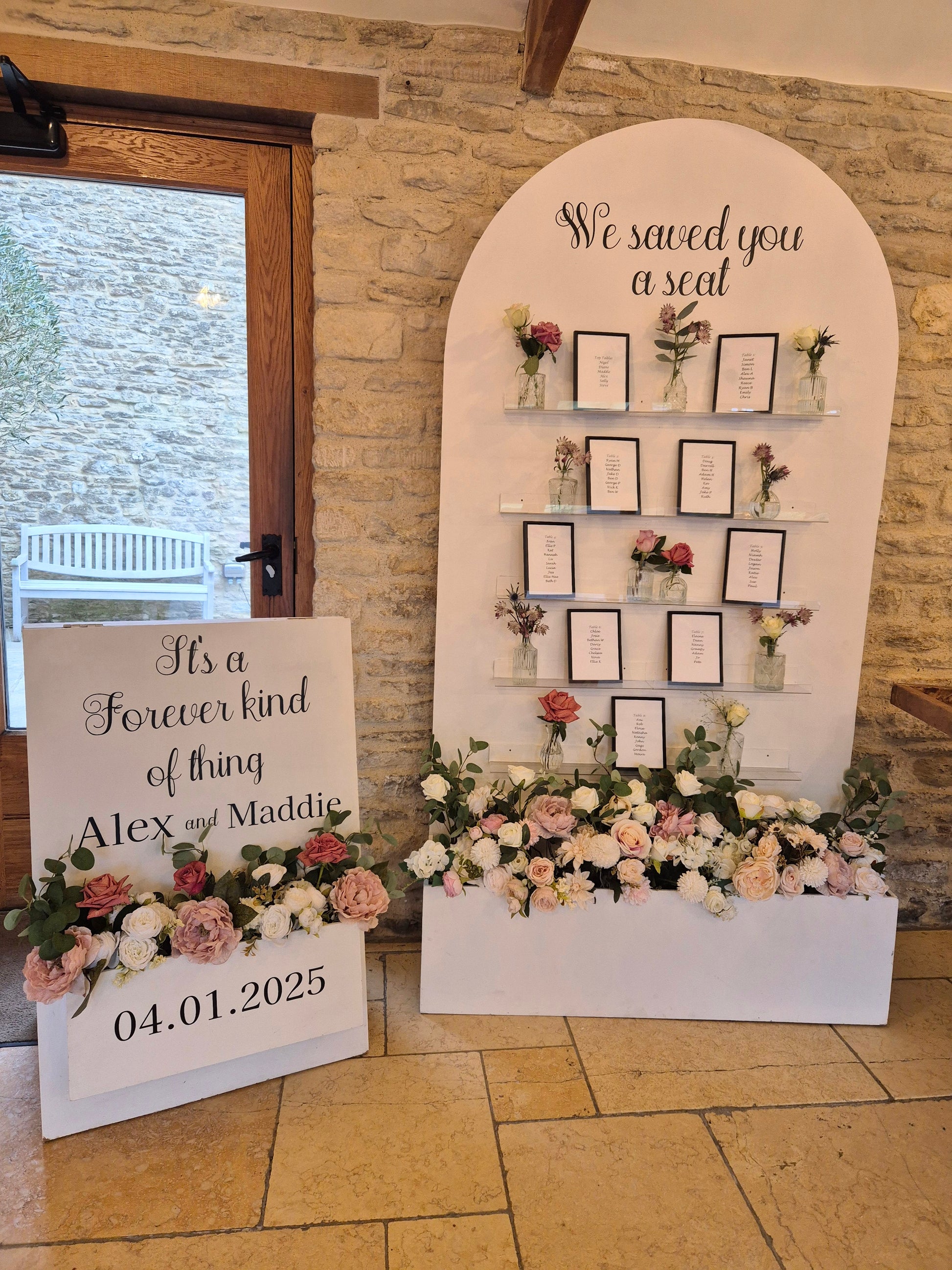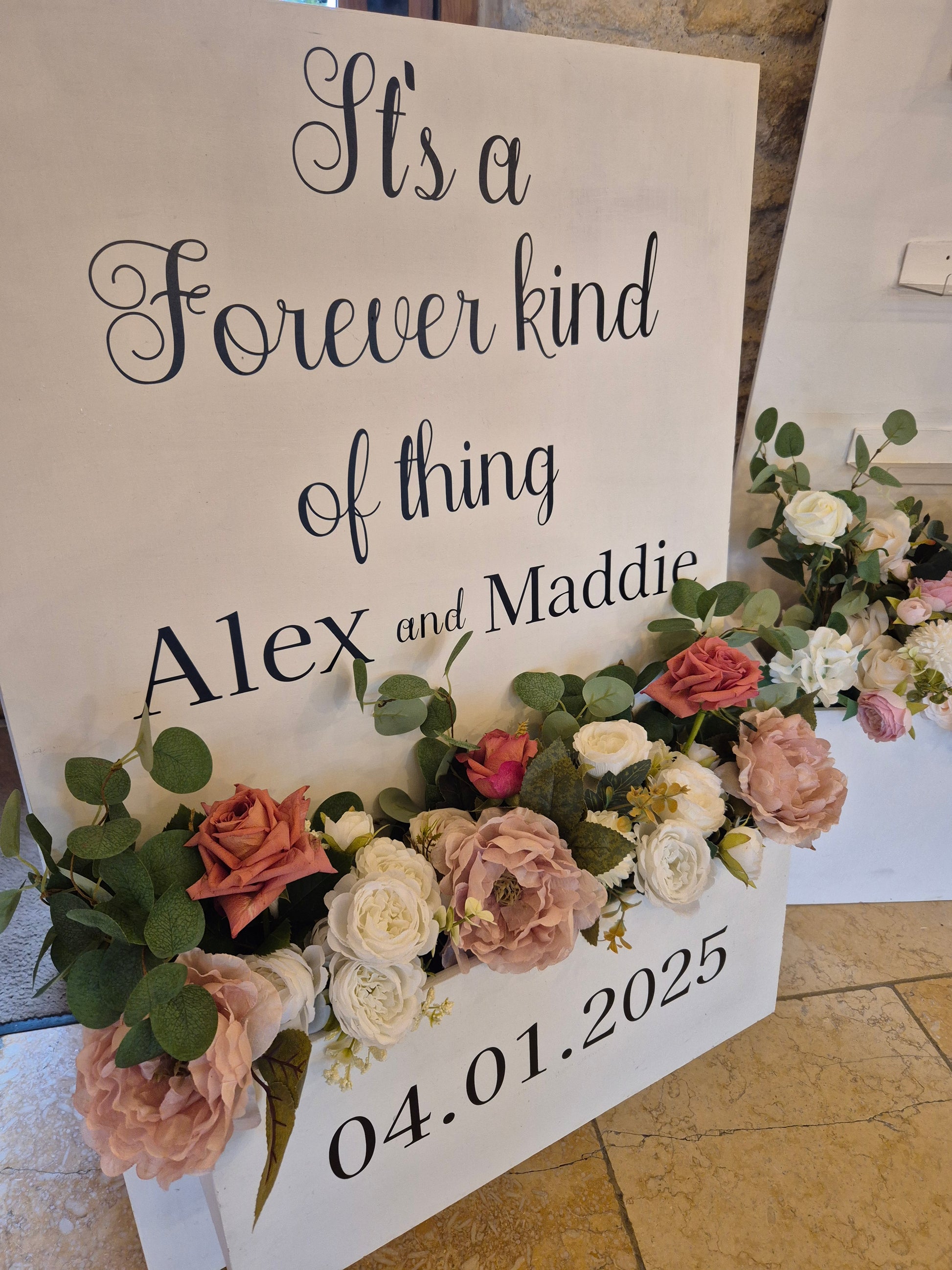 Our signs come filled with flowers to match your colour scheme, fully design with the wording of your choice and personalised with your names and special date. Also available in white.