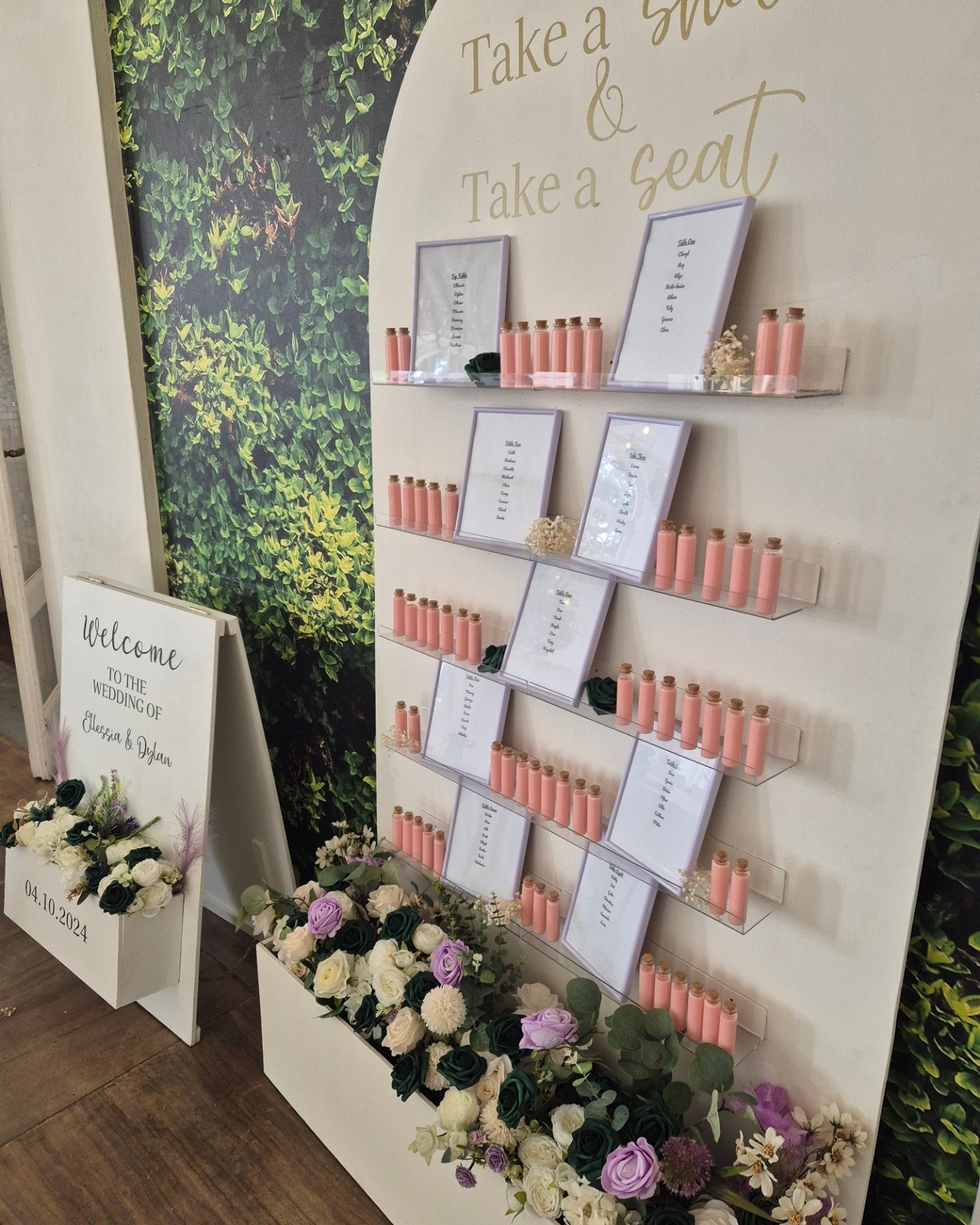 - Our 7ft handmade seating plan favour wall filled with flowers to match your colour scheme